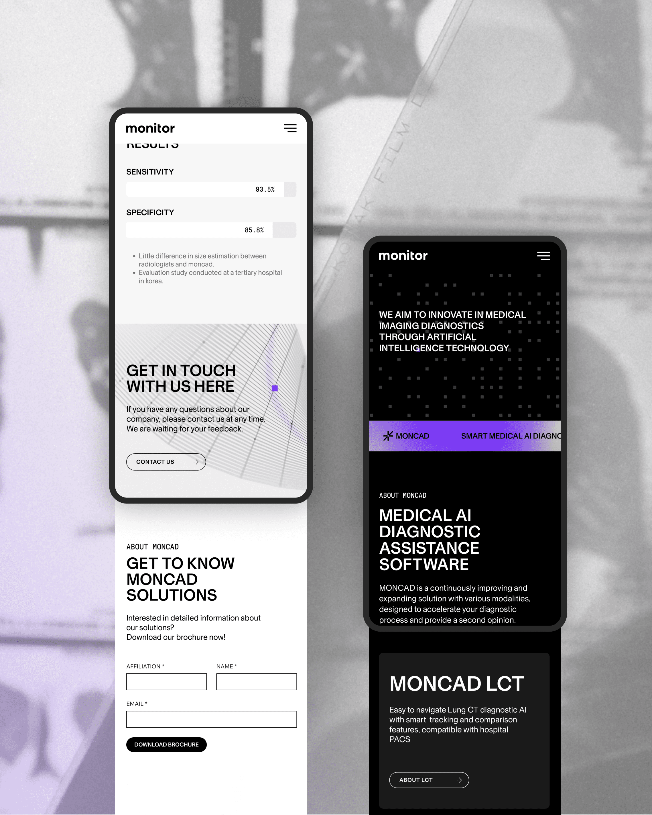 MONCAD is a Medical AI solution that supports fast and accurate cancer diagnosis using AI technology. We visualized its technological expertise through a new brand identity inspired by “light,” symbolizing speed and precision. The use of purple and animated 3D elements conveys a future-forward and trustworthy image. Applied across the website and key materials, the renewed brand helps position MONCAD as a credible medical solution both in Korea and globally.